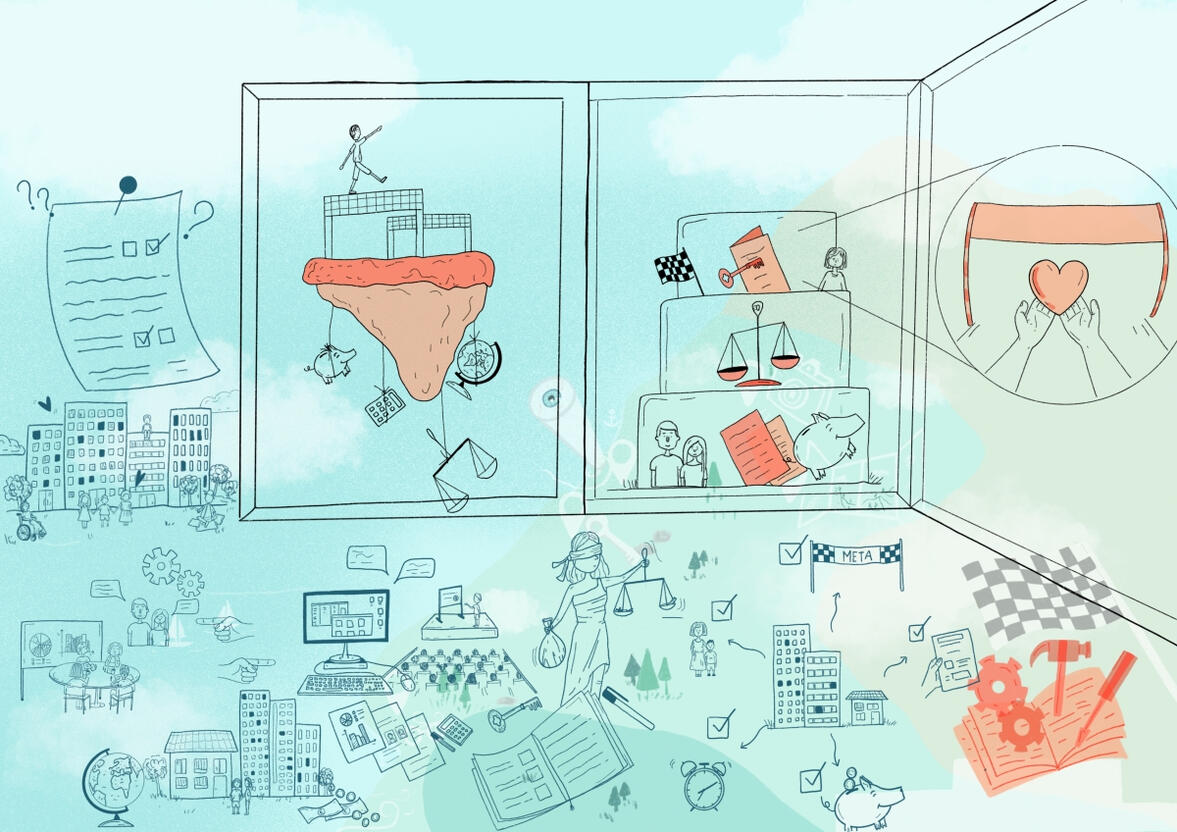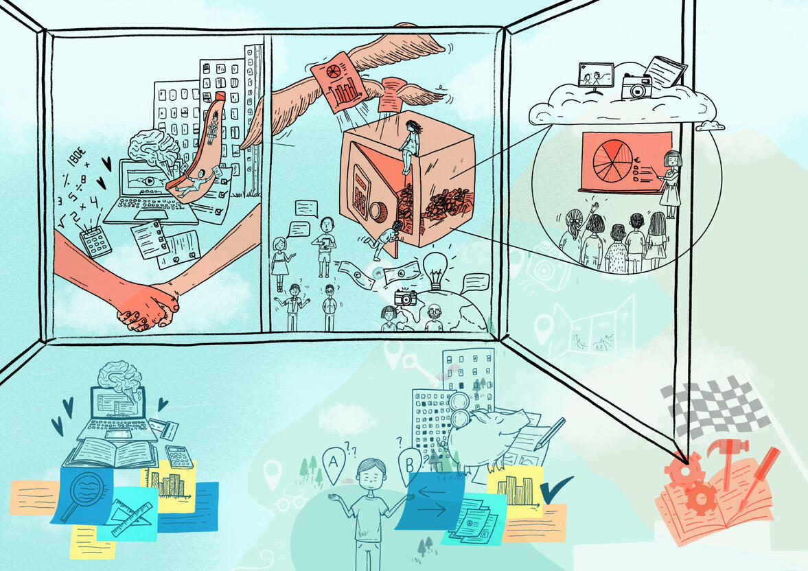 A ilustração desenhada ao longo da primeira sessão torna palpável o cruzamento de diferentes olhares: como é que cada um/a de nós vê a transparência, a prestação de contas e a accountability? As várias janelas que ressaltam na ilustração — uma analogia às diferentes lentes com que podemos olhar a realidade da accountability e da prestação de contas no setor da economia social português — revelam traços do debate concetual promovido na sessão, bem como um leque de ferramentas gestionárias com maior ou menor orientação para a transparência organizacional.